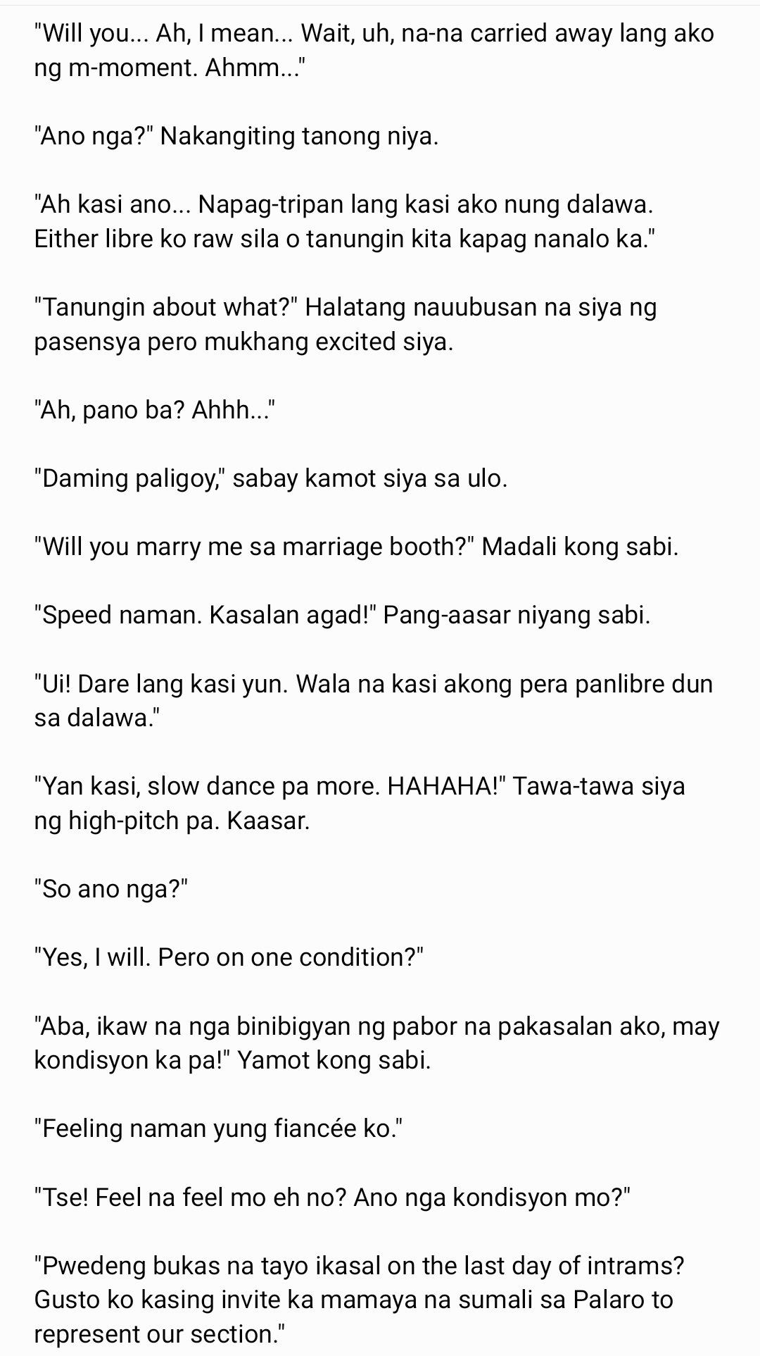 Pinipilit unawain ang kanilang nararamdaman ang inis galit at pagkamuhing umiiral. Sa sobrang inis ko binato ko sa kanya yung book niya oo tapos ko na labwanows. Naalala niya ang masasakit na salitang bitiw ng may-ari ng kainan at ang paghihinala nitong nangupit siya ng empanada.